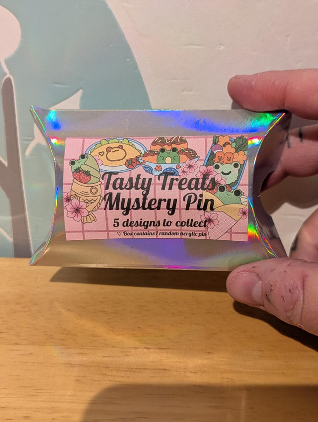 You will receive a mystery pin, wrapped in paper and inside a reflective cardboard box.
